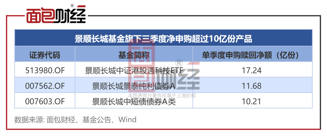获得净申购较多的基金以被动指数型基金、混合债券型基金、纯债型基金为主。其中,景顺长城中证港股通科技ETF三季度获得净申购17.24亿份。