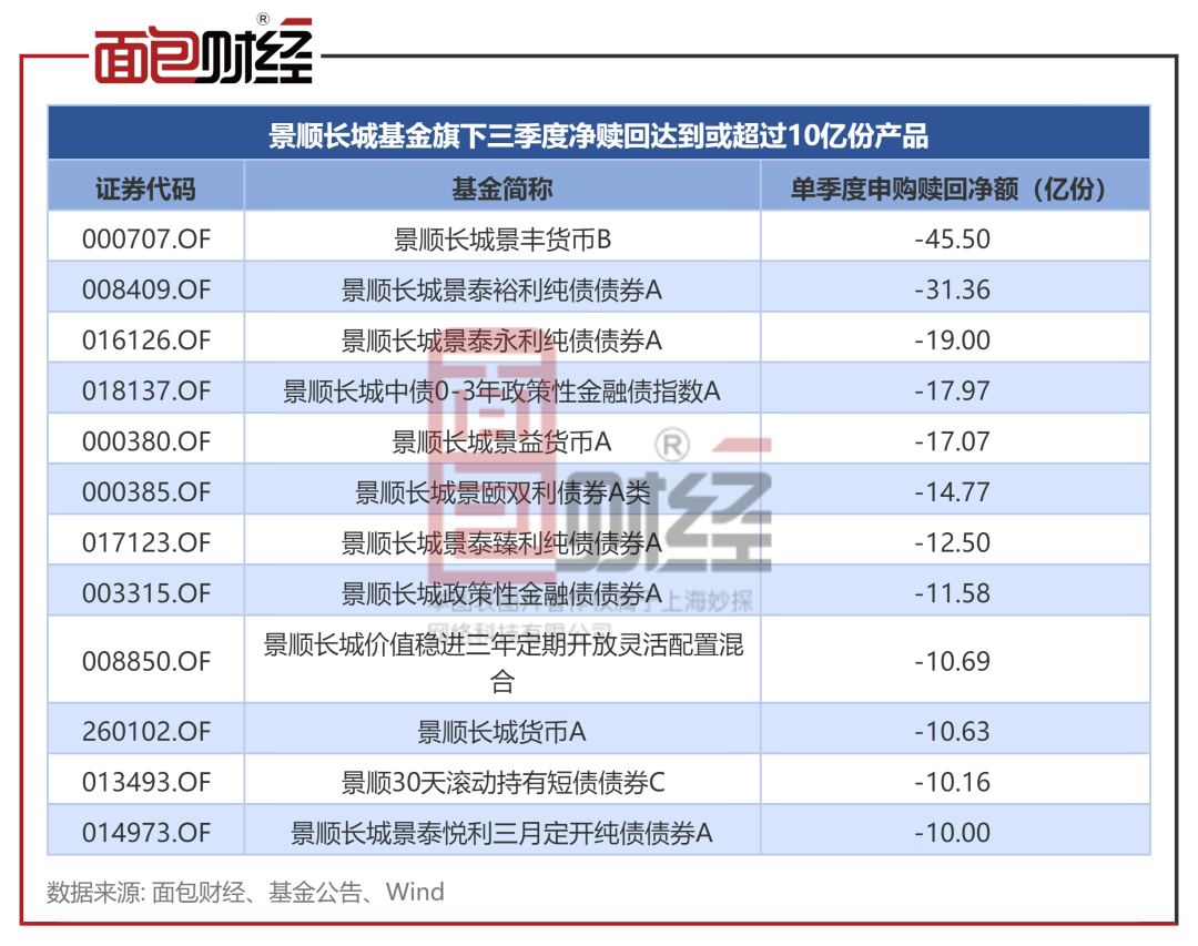 景顺长城景益货币A、景顺长城货币A也是三季度景顺长城基金旗下货币市场型基金中被赎回较多的产品,均被赎回超过10亿份。